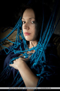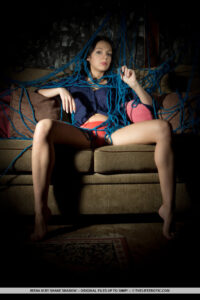 Alors que certaines personnes ont du fétiche pour les bas soyeuses ou les lingeries à froufrous, Irena a le fétiche pour les cordes. Qu’elle soit liée par la corde pour une expérience BDSM, ou même la sensation des cordes s’emmêla sur tout son corps, les cordes déclenchent totalement sa libido et sa confiance. Assis confortablement sur un canapé rembourré, un gâchis emmêlé de cordes bleues rivalise sur et autour de la tête d’Irena, vers ses cuisses. Elle enlève sa chemise bleu marine, révélant un corps lisse et saule vêtu de lingerie en dentelle de couleur pêche. Le photographe Shane capture Irena en action dans des gros plans et des compositions à couper le souffle alors qu’elle caresse, taquine et se masturbe sur le canapé.
